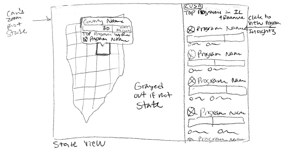 To illustrate insights at a national and state level, I mimicked the layout for the electoral college map. State and county data would be mapped and displayed on a color scale, created using the min and max of the dataset.