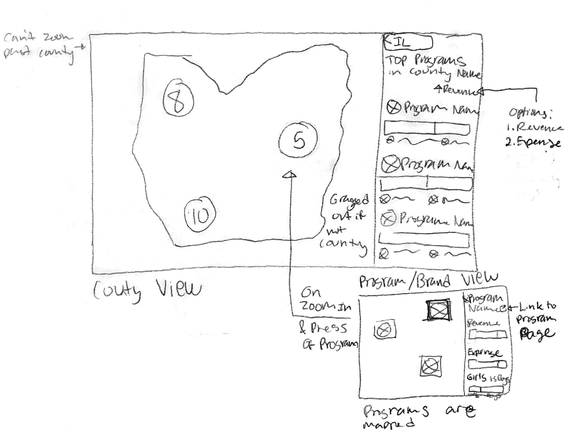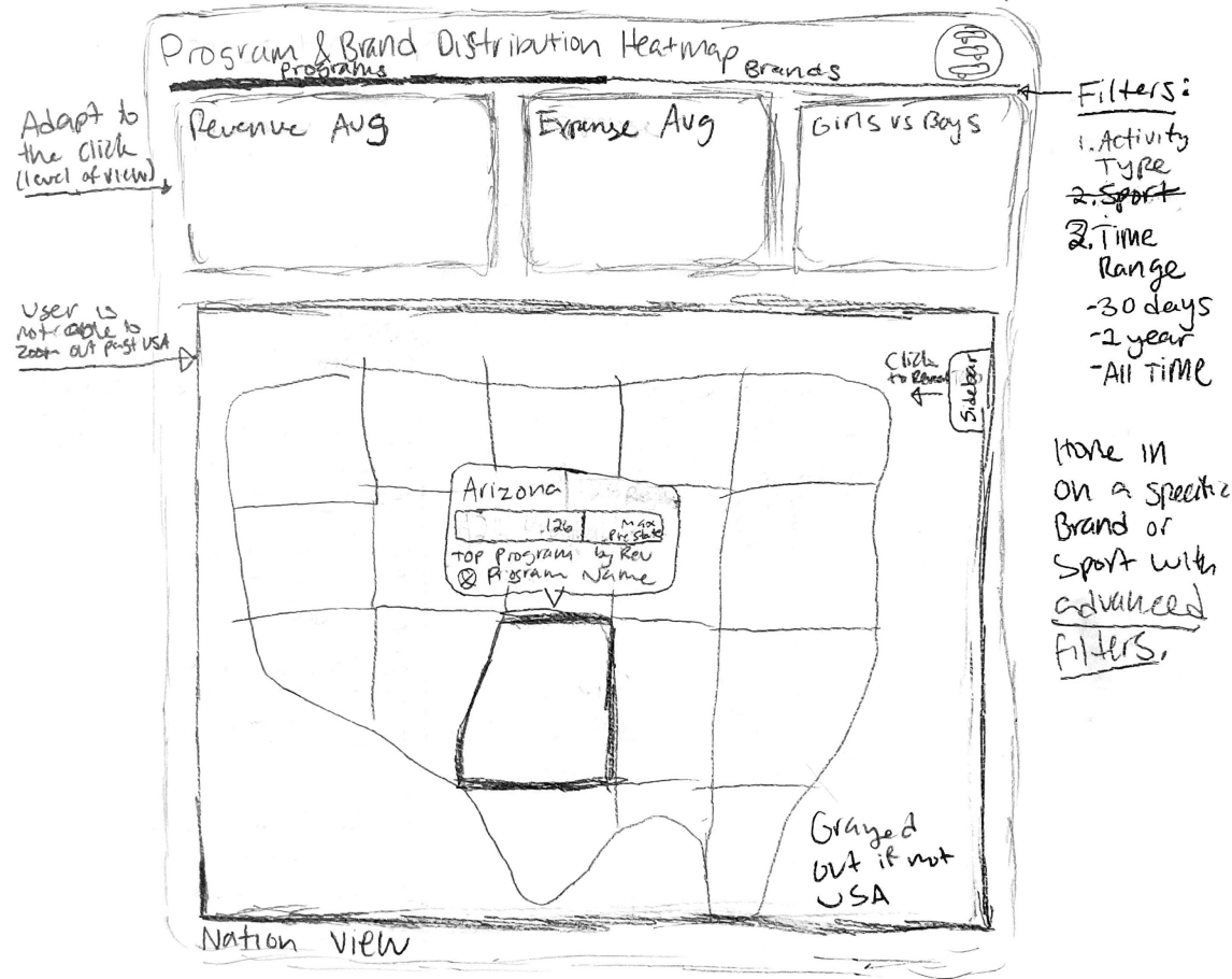 With two ways of visualizing athletic organization performance, I sketched to visualize how the user would interact with the new heat map and transition between views.