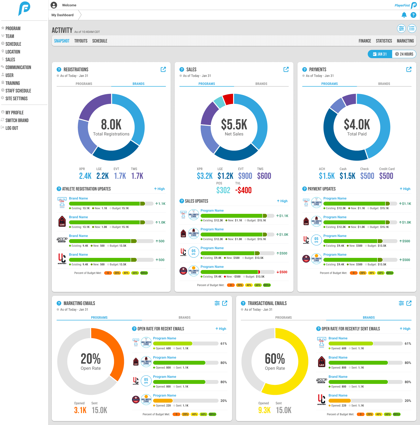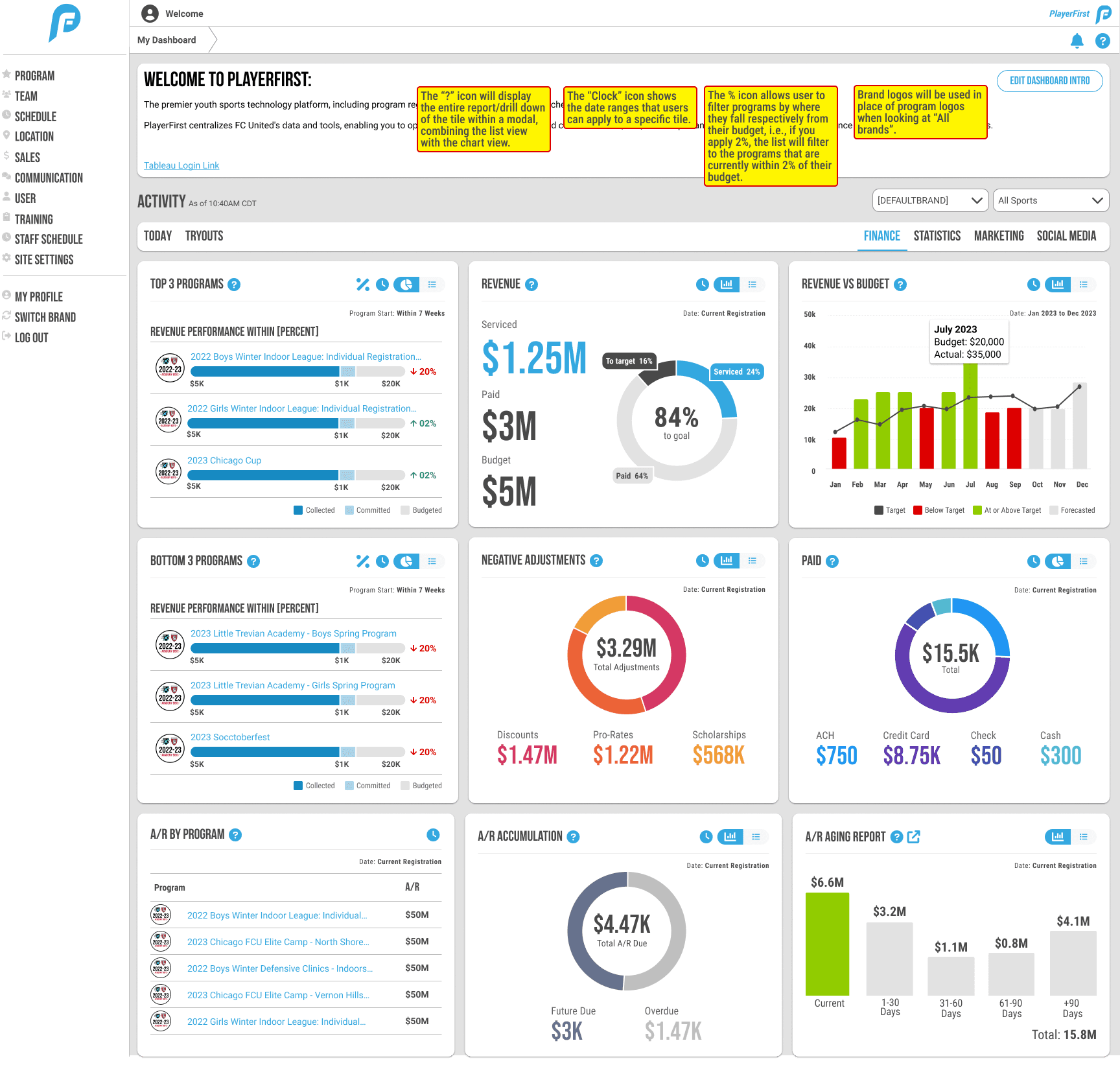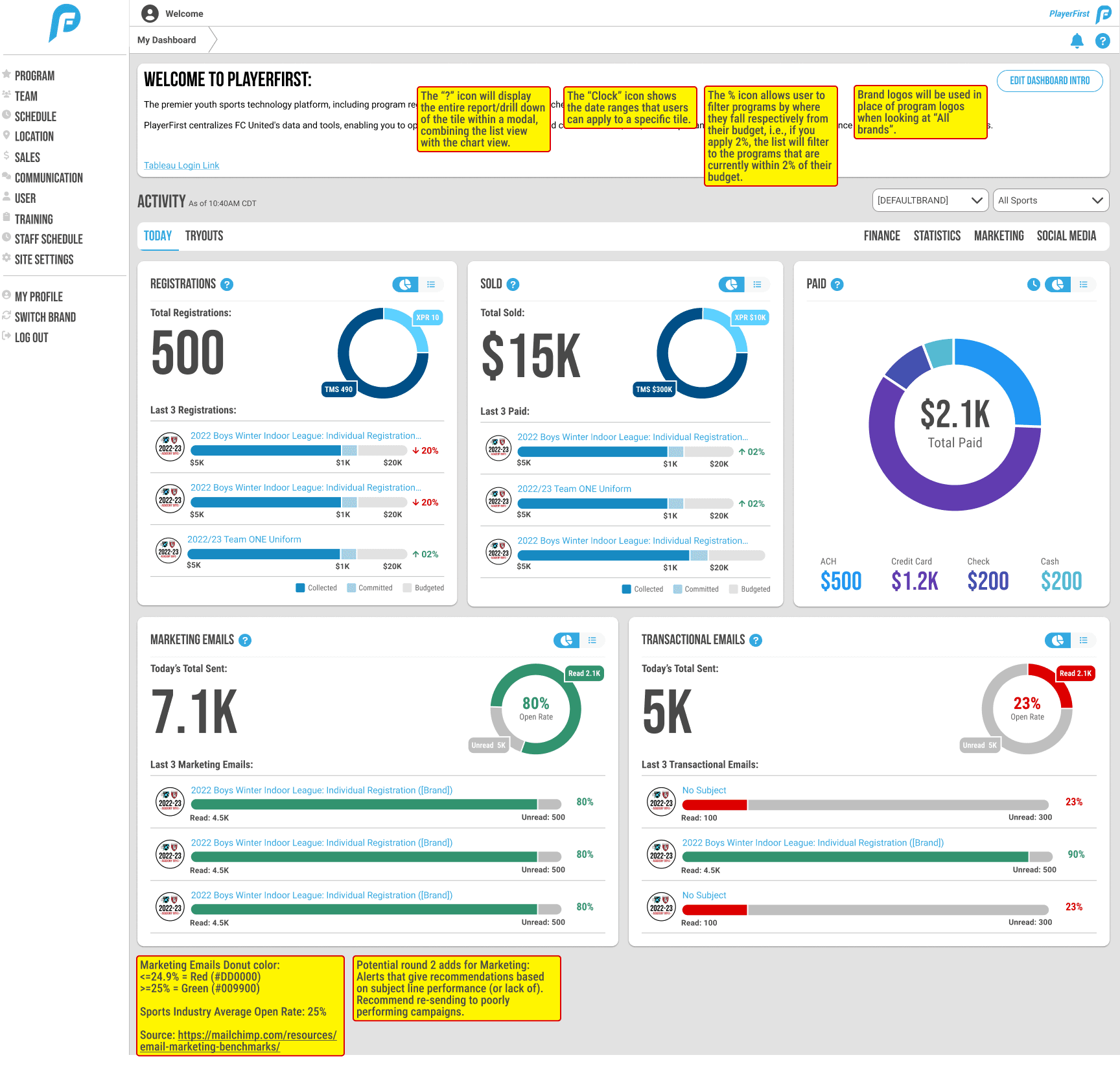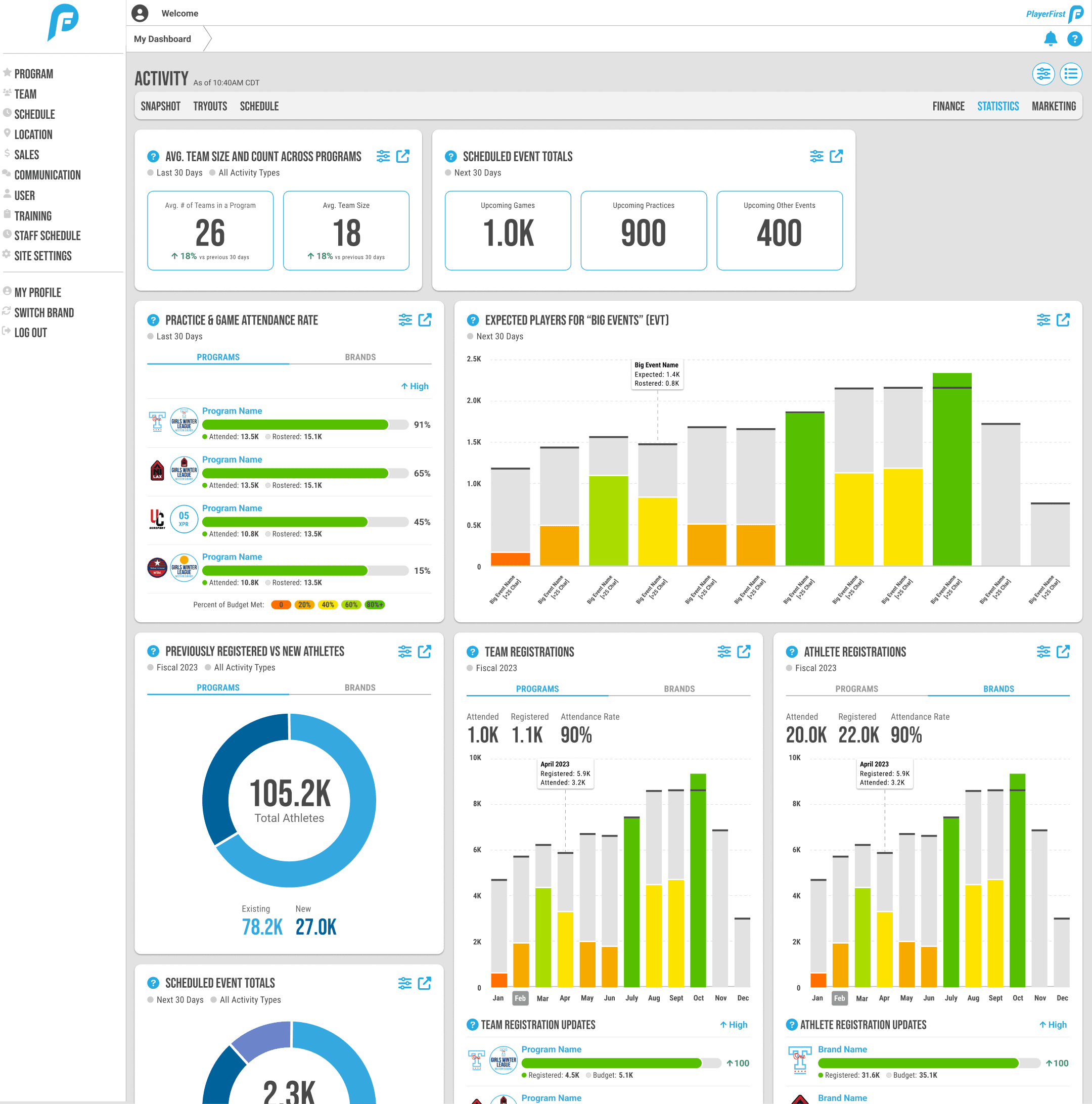 To better inform admin and coaches after they login to the PlayerFirst management platform, stakeholders decided to reimagine the landing page. In its place would be a multi-tab dashboard that orients the user by visualizing short and long term organizational insights.