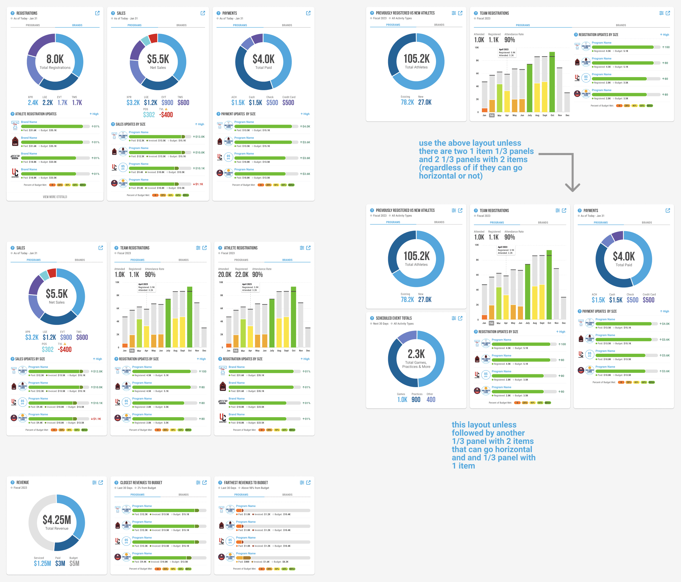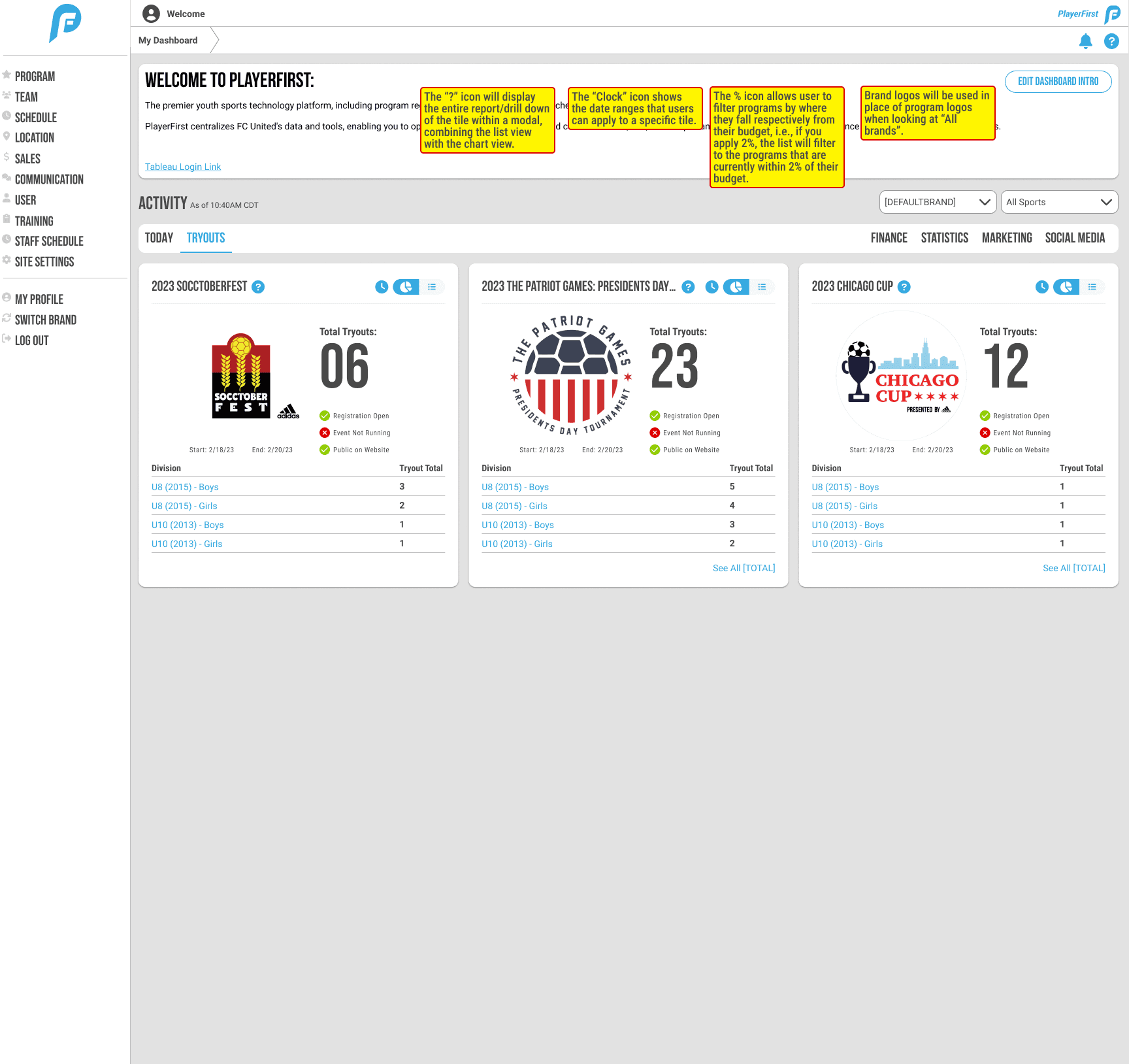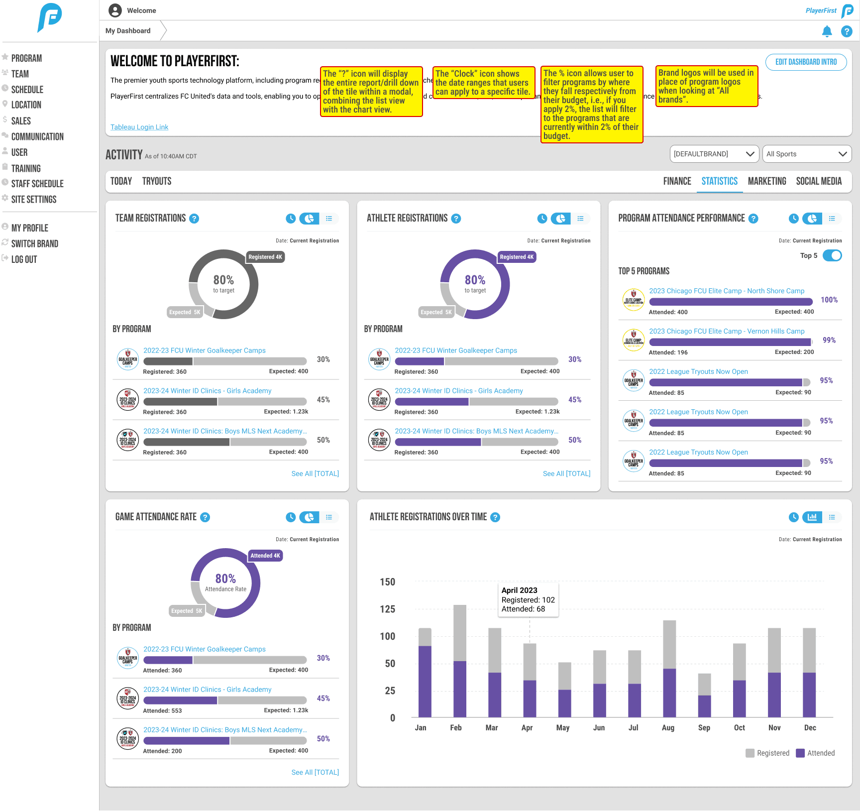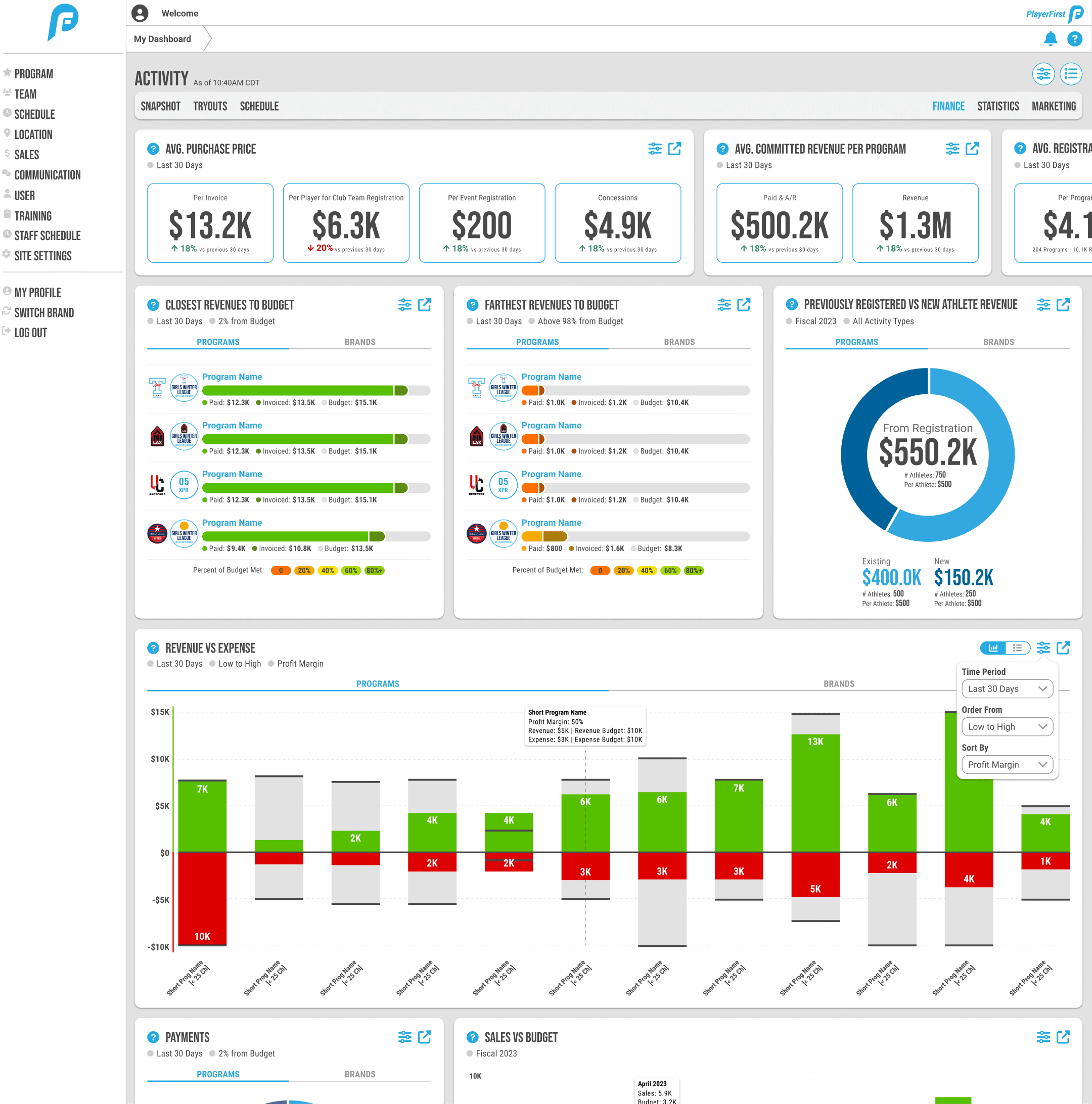 To better inform admin and coaches after they login to the PlayerFirst management platform, stakeholders decided to reimagine the landing page. In its place would be a multi-tab dashboard that orients the user by visualizing short and long term organizational insights.