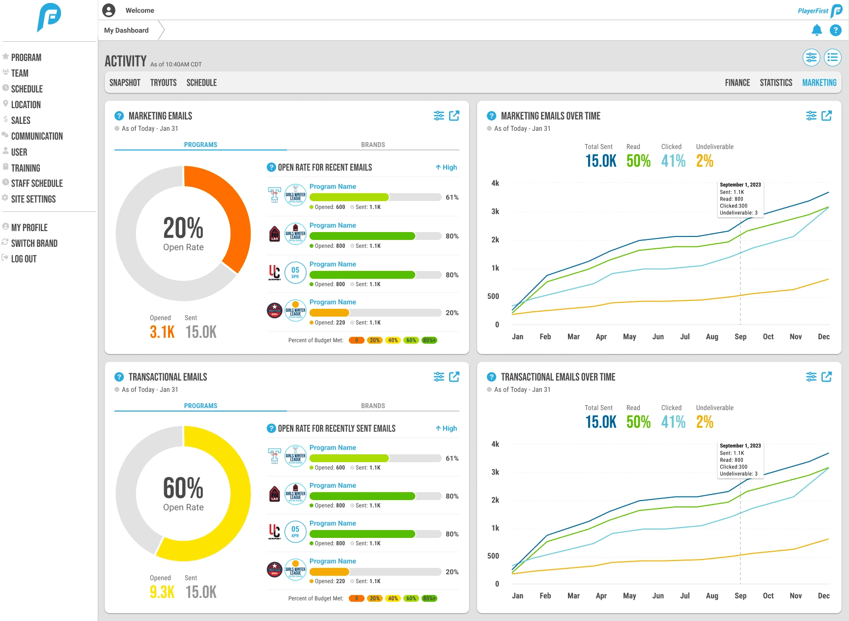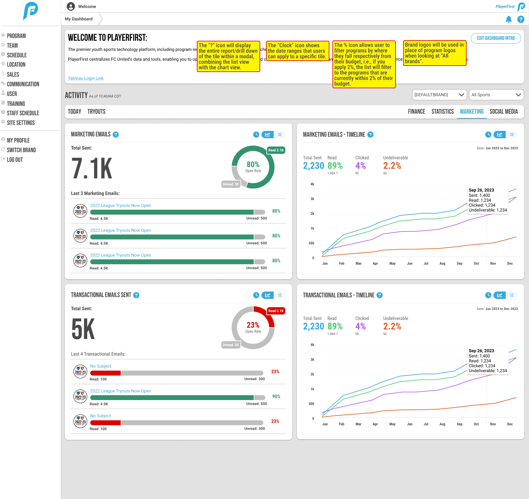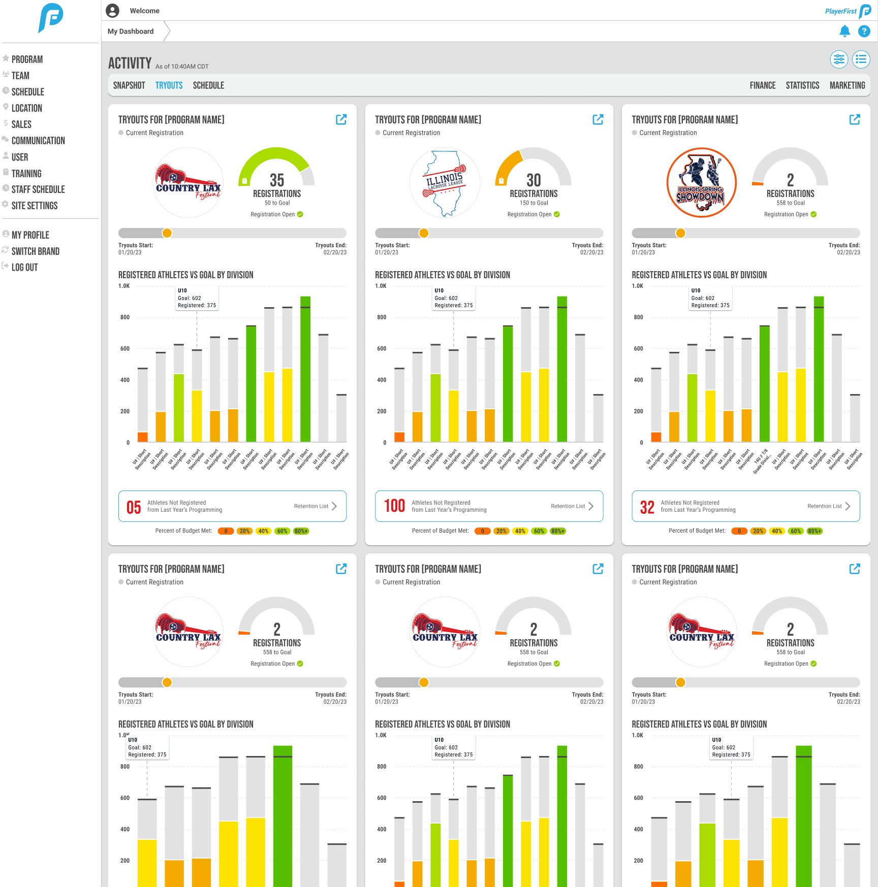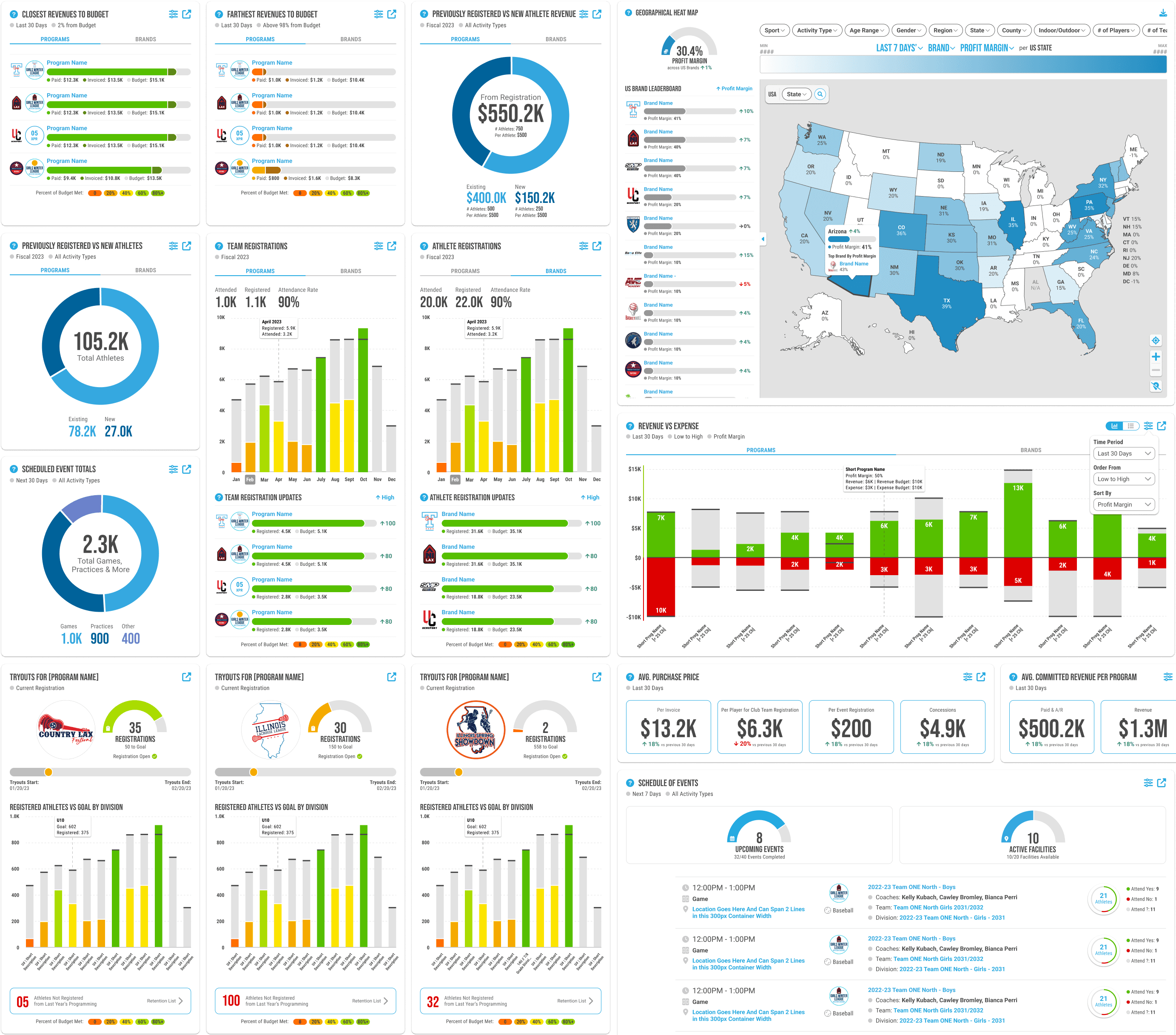To better inform admin and coaches after they login to the PlayerFirst management platform, stakeholders decided to reimagine the landing page. In its place would be a multi-tab dashboard that orients the user by visualizing short and long term organizational insights.