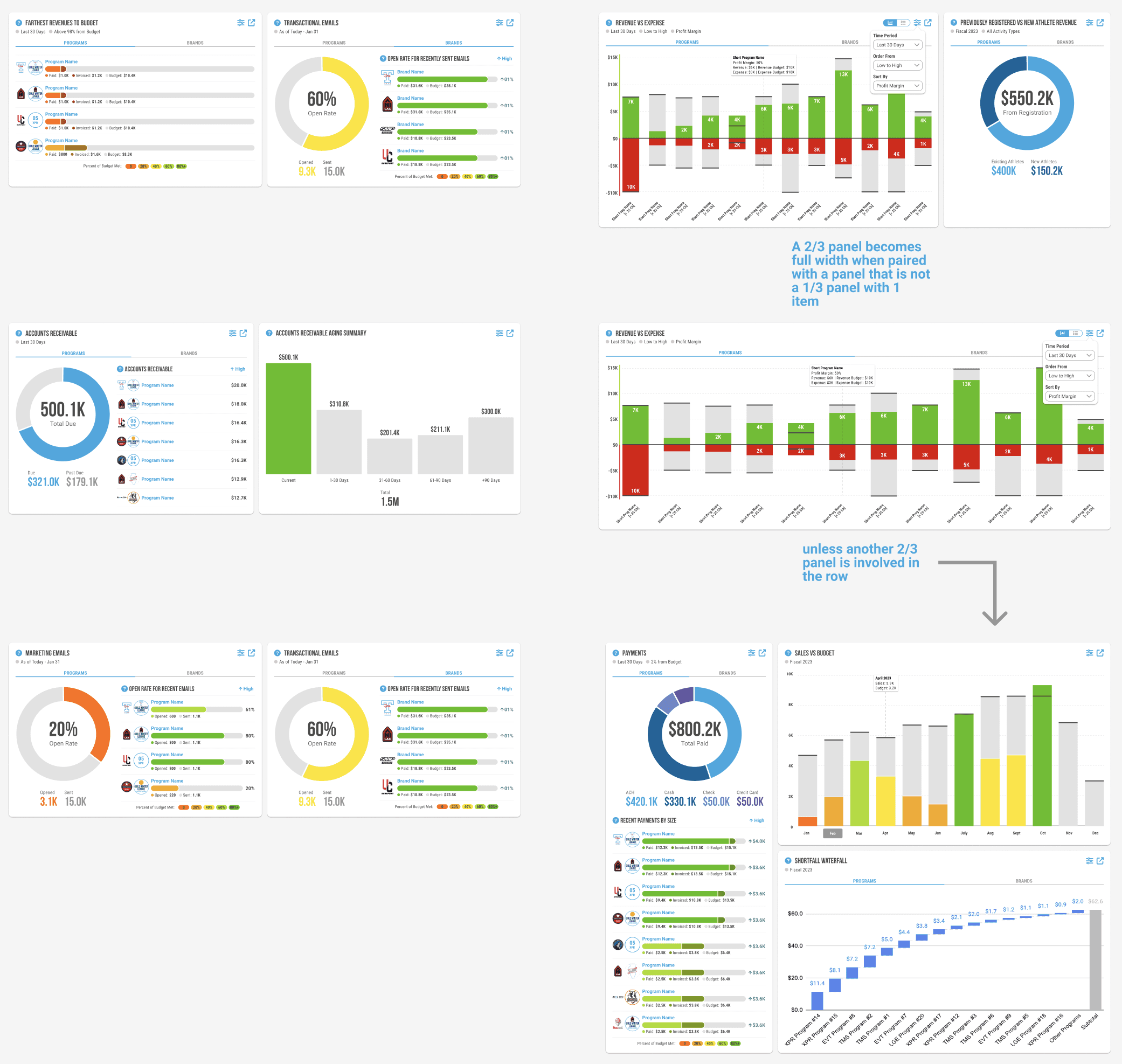 Prior to my joining the company, Kadie, the design manager, created her first iteration with Workday's existing dashboards as a key inspiration . Stakeholders particularly admired the clear information hierarchy seen in the donut charts. By using the tile approach, we could create a dashboard that addresses the many topics surrounding athletics management in detail.