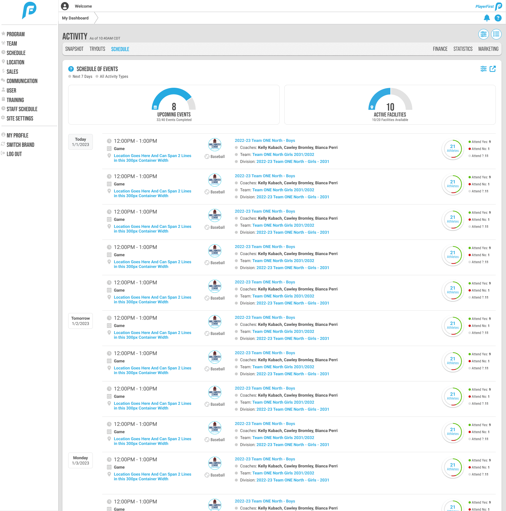 The dashboard would need to provide admin with both long-term and short-term insights to help coaches understand their organization's overall progress and most recent updates. By providing these insights upon login, admin would be prompted to analyze the current state of the many areas of the PlayerFirst athletic management platform.
