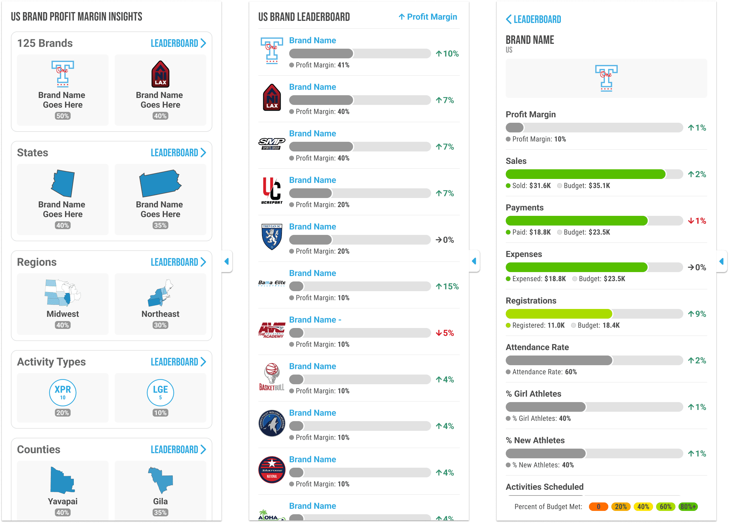 The platform desperately needed a central landing page that synthesized this info scattered across various tabs. With this insights immediately accessible, admin and coaches could quickly check in on how their brands were performing and take necessary action.