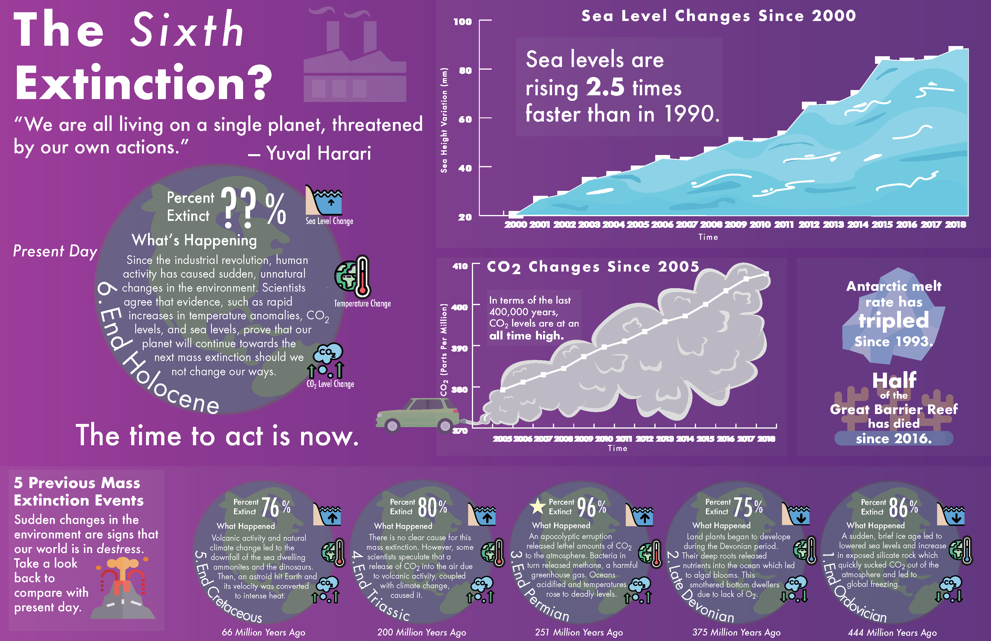 The final version also encourages the viewer to draw comparisons between current environmental issues and the conditions during the previous extinction events, through iconography representing sea level, global temperature, and carbon dioxide changes.